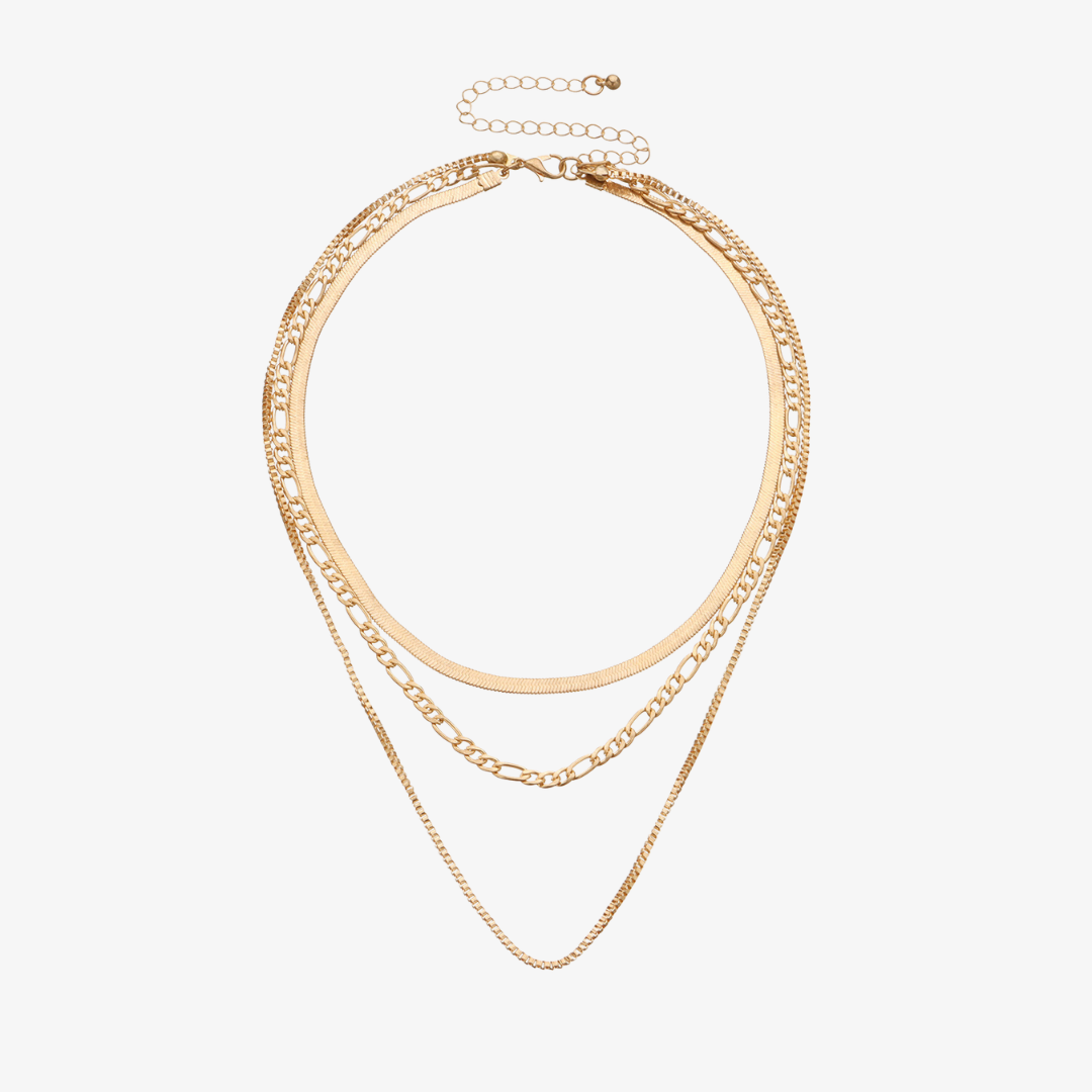 Eleva tu estilo diario con el Collar de Mujer Boho de Triple Capa, una pieza llamativa que combina elegancia con encanto natural. Diseñado con tres cadenas distintas — tipo espiga, cubana y eslabón clásico — este diseño en capas añade profundidad y sofisticación a cualquier conjunto, desde un look casual chic hasta uno de noche más glamuroso.